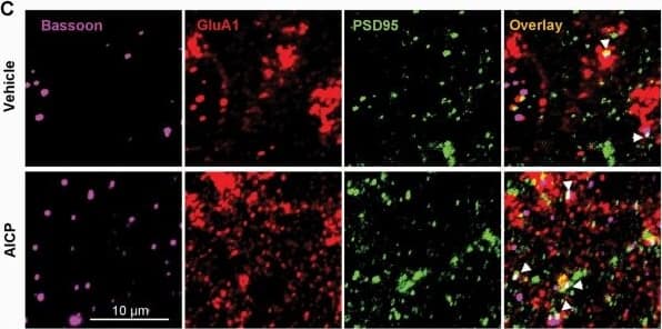 Bassoon is a 420 kDa protein that is a localized at the presynaptic nerve terminals and is believed to play a role in the structural and functional organization of the synaptic vesicle cycle (1-3). Bassoon does not belong to any known protein families. It has been found in rat and mouse with sequence identity of the two proteins at 96% (1). The human BASSOON gene has recently been cloned and localized (3). Bassoon is predicted to contain two double-zinc fingers, three coiled-coil regions, and two polyglutamine domains (1). The polyglutamine domains in the C-terminus are of interest, since it is known that for some human proteins, such as Huntingtin, abnormal amplification of this region can cause late-onset neurodegeneration (1,3). Bassoon is concentrated at sites opposite to postsynaptic densities in synaptic terminals and in cultured neurons, it is found to colocalize with GABA (A) and glutamate (GluR1) receptors (2). Another presynaptic protein, Piccolo (4) was found to colocalize with Bassoon in cultured hippocampal neurons (1). These observations suggested that they serve specific functions at synaptic junctions and may be involved in organization of the cytoskeleton at the site of neurotransmitter release (1).