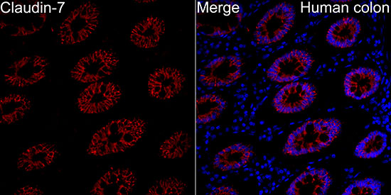 The Claudin superfamily consists of many structurally related proteins in humans. These proteins are important structural and functional components of tight junctions in paracellular transport. Claudins are located in both epithelial and endothelial cells in all tight junction-bearing tissues. Three classes of proteins are known to localize to tight junctions, including the Claudins, Occludin and junction adhesion molecule (JAM). Claudins, which consist of four transmembrane domains and two extracellular loops, make up tight junction strands. Claudin expression is highly restricted to specfic regions of different tissues and may have an important role in transcellular transport through tight junctions. mRNA studies indicate that claudin-7 is specifically expressed in mouse lung and kidney, but not in heart, brain, spleen, liver, skeletal muscle or testis. The gene encoding human claudin-7 maps to chromosome 17p13.