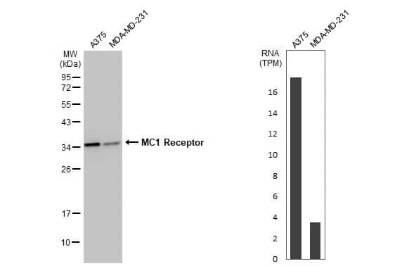 MC1R, a Melanocortin Receptor, mediates the effects of melanocyte-stimulating hormone (MSH) and adrenocorticotropic hormone (ACTH). MSH and its receptor, MC1R, are key regulators of melanogenesis. They control the relative proportions of red pheomelanin and black photoprotective eumelanin in the skin by increasing the production of eumelanin. Non-functional, truncated forms of the receptor lead to lighter coat color in animals. In contrast, constitutively active receptors lead to darker color. Pheomelanin generates free radicals in response to UV radiation, and elevated levels of pheomelanin have been associated with higher risk of UV-induced skin damage. Therefore, MC1R is a major determinant of sun sensitivity and genetic risk for melanoma and other skin cancers. Expression of melanocortin 1 receptor has been reported primarily in adrenal, skin, and testis. ESTs have been isolated from breast, placenta, and testis libraries.