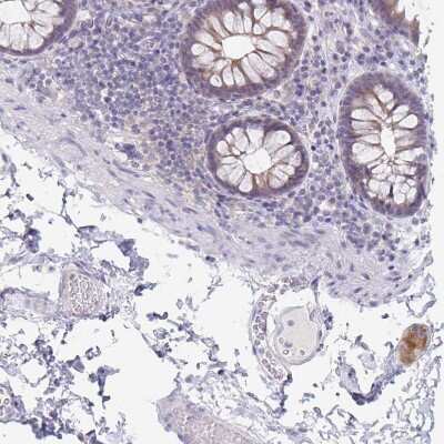Immunohistochemistry-Paraffin: 5-HT2A Antibody [NBP1-90318] - Staining of human colon shows strong cytoplasmic positivity in peripheral ganglion.