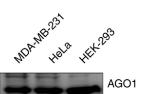 | Application Notes | Use in Immunocytochemistry/Immunofluorescence reported in scientific literature (PMID:32812257)WB: In transfected HEK293 transiently expressing human EIF2C1bands of approx. 110 Knockdown Validateda band and 35 Knockdown Validateda band are observed. The 110 Knockdown Validateda band is not observed in the non-transfected HEK293. The calculated molecular size is 97.2 Knockdown Validateda band according to NP_036331.1 |