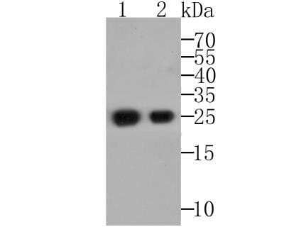 24 kDa. Disclaimer note: The observed molecular weight of the protein may vary from the listed predicted molecular weight due to post translational modifications, post translation cleavages, relative charges, and other experimental factors. |