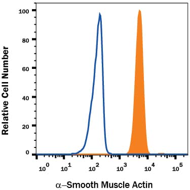 Human peripheral blood mononuclear cell (PBMCs) were stained with Mouse Anti-Human a-Smooth Muscle Actin Alexa Fluor® 405-conjugated Monoclonal Antibody (Catalog # IC1420V, filled histogram) or isotype control ...read more