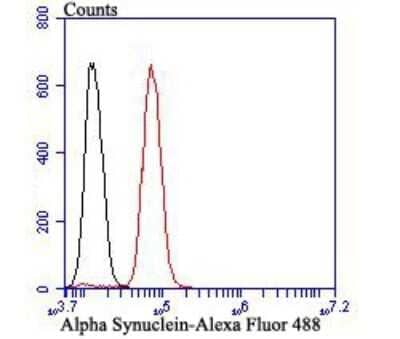 Alpha-synuclein, a member of the synuclein family, is a protein that was first identified in 1988 whose name is derived from its localization to both the synapse and nucleus (1-3). Specifically, it is expressed primarily in the brain, including Lewy Bodies (1-6). Alpha-synuclein is encoded by the SNCA gene, located on chromosome 4p21, and is processed as a 140 amino acid (aa) protein with a theoretical molecular weight of 14 kDa (1,2,4). Structurally alpha-synuclein consists of a N-terminal binding domain (1-60 aa), a central domain core region called the non-amyloid-beta component (NAC) (61-95 aa), and a C-terminal domain (96-140 aa) (1-3). The N-terminal region contains aa repeats with a KTKEGV consensus sequence that gives the protein its alpha-helical structure that associates with lipid membranes (1-4). The hydrophobic NAC region is responsible for alpha-synuclein aggregation and fibril formation (1-4). The acidic C-terminal tail is largely unstructured but can be targeted for post-translational modifications (1-4). The function of alpha-synuclein is not entirely understood, but it is shown to have a role in suppression of apoptosis, acting as a molecular chaperone, regulating glucose, and modulating calmodulin activity (1,3).