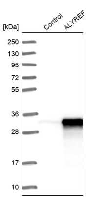 Pre-mRNA splicing plays an important role in regulation of gene expression. During the splicing process, specific proteins are recruited to the mRNA and assembled into a complex of mRNA-protein near the exon-exon junction. This complex is termed the mRNA-protein complex (mRNP) or the exon-exon junction complex. The proteins that are found in this complex include: Y14, magoh, Aly/REF, RNPS1, Upf3, and DEK.1-5 Aly (also known as mREF1-I) is the mammalian homologue of the yeast mRNA export factor Yra1p.6-7 It is a 233 amino acid RNAbinding protein that contains a RNA-binding domain and is recruited to the mRNP complexes during the splicing. Excess of recombinant expression of Aly in the cells increases both the rate and efficiency of spliced and unspliced mRNA export (in vivo) from the nucleus to the cytoplasm. In contrast to the Y14 protein, Aly is dissociated from the mRNAs after the export to the cytoplasm.1, 5-6