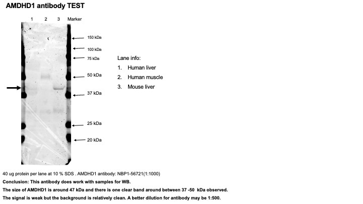 | Immunogen | Synthetic peptides corresponding to AMDHD1(amidohydrolase domain containing 1) The peptide sequence was selected from the N terminal of AMDHD1. Peptide sequence AVLEGASLVVGKDGFIKAIGPADVIQRQFSGETFEEIIDCSGKCILPGLV. The peptide sequence for this immunogen was taken from within the described region. |