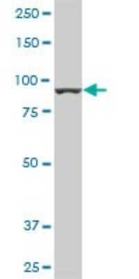 Western Blot: AMPD2 Antibody (2F5) [H00000271-M01A] - Analysis of AMPD2 expression in transfected 293T cell line by AMPD2 monoclonal antibody (M01A), clone 2F5.Lane 1: AMPD2 transfected lysate(92.1 KDa).Lane 2: ...read more