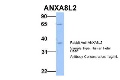 ANXA8L2 is a member of the annexin family of evolutionarily conserved Ca2+ and phospholipid binding proteins. The protein may function as an anticoagulant that indirectly inhibits the thromboplastin-specific complex. Overexpression of this gene has been associated with acute myelocytic leukemia. A highly similar duplicated copy of this gene is found in close proximity on the long arm of chromosome 10.This gene encodes a member of the annexin family of evolutionarily conserved Ca2+ and phospholipid binding proteins. The encoded protein may function as an an anticoagulant that indirectly inhibits the thromboplastin-specific complex. Overexpression of this gene has been associated with acute myelocytic leukemia. A highly similar duplicated copy of this gene is found in close proximity on the long arm of chromosome 10.