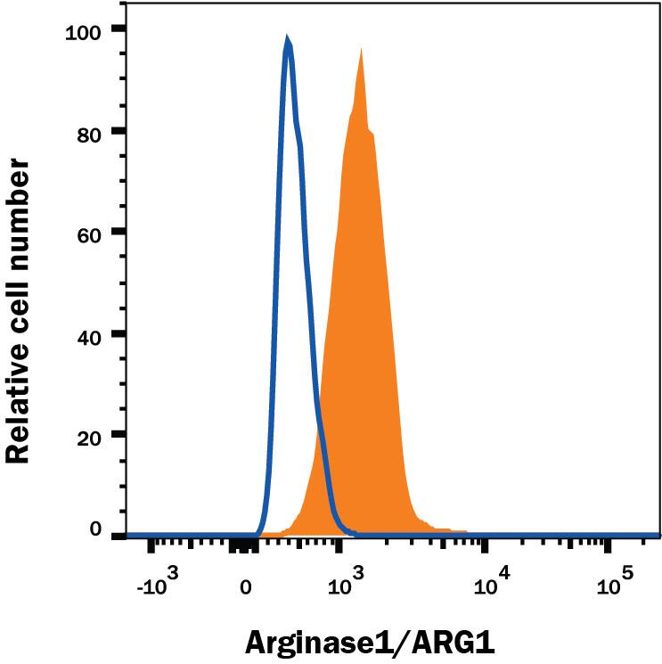 Arginase 1 (ARG1) is a 35‑40 kDa member of the arginase family of enzymes. It is expressed in multiple cell types, including erythrocytes, hepatocytes, neutrophils, smooth muscle and macrophages. ARG1 demonstrates two distinct functions: in the hepatocyte cytoplasm, it catalyzes the conversion of arginine to ornithine and urea, while in multiple cells, it degrades arginine, thus indirectly downregulating NO synthase (NOS) activity by depriving this enzyme of its substrate. Human ARG1 is 322 amino acids (aa) in length. Its enzyme region comprises aa 9‑309 and contains two Mn atoms. ARG1 is moderately active as a monomer, but highly active as a 105 kDa homotrimer. Trimerization is promoted by nitrosylation of Cys303, creating a regulatory feedback loop with NOS. There are two isoform variants, one that shows an eight aa insertion after Gln43, and another that shows a deletion of aa 204‑289. Full-length human ARG1 shares 87% aa identity with mouse and rat ARG1.