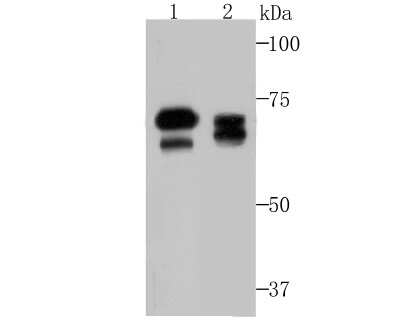 | Theoretical MW | 68 kDa. Disclaimer note: The observed molecular weight of the protein may vary from the listed predicted molecular weight due to post translational modifications, post translation cleavages, relative charges, and other experimental factors. |