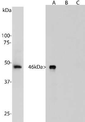 46 kDa. Disclaimer note: The observed molecular weight of the protein may vary from the listed predicted molecular weight due to post translational modifications, post translation cleavages, relative charges, and other experimental factors. |