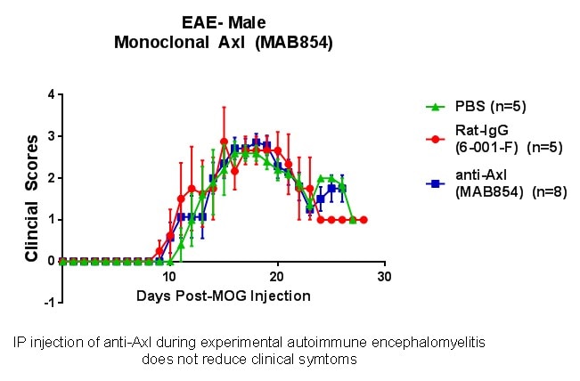 | Specificity | Detects mouse Axl in ELISAs and Western blots. Does not cross-react with recombinant human (rh) Axl, rmDtk, or rmMer. |