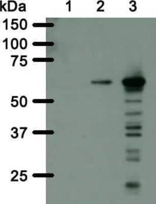 Western Blot: BirA Antibody (5B11c3-3) [NBP2-59939] - Analysis in total cell lysate of parental HF (lane 1) or HF stably expressing GFP-NLS-BirA without (lane 2) or with induced expression (lane 3) were transferred to a ...read more