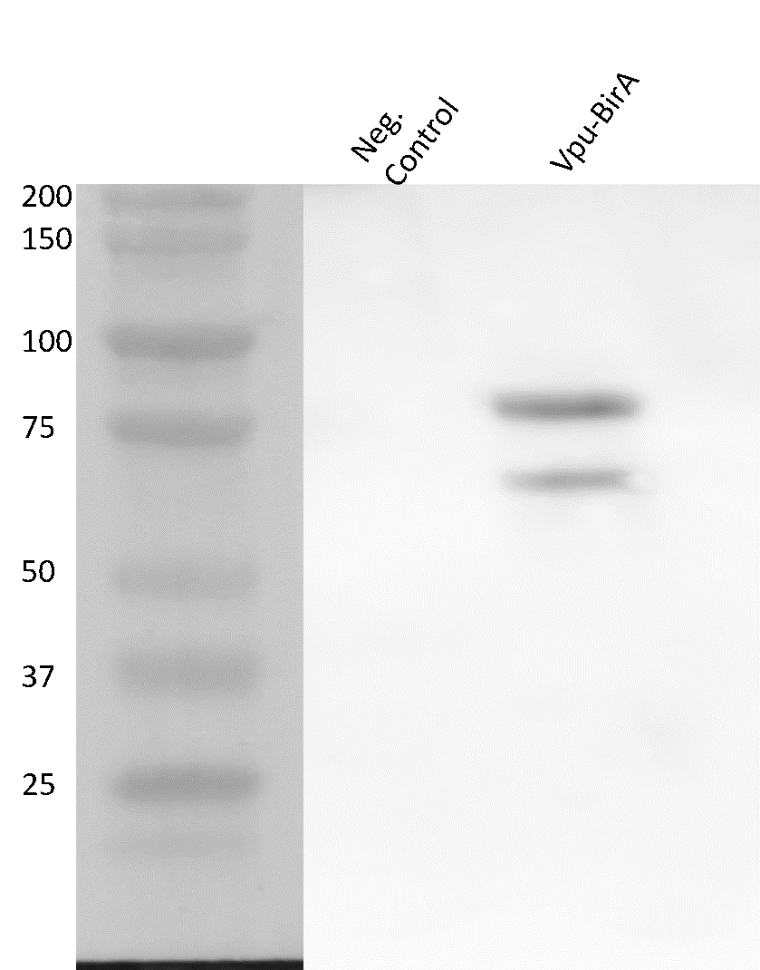 Antibody diluted 1:1000. Blots came out clean. The cells were HEK-293 transfected with either pcDNA3.1(+) empty vector as a negative control or the pcDNA vector expressing the HIV-1 Vpu fused to BirA.