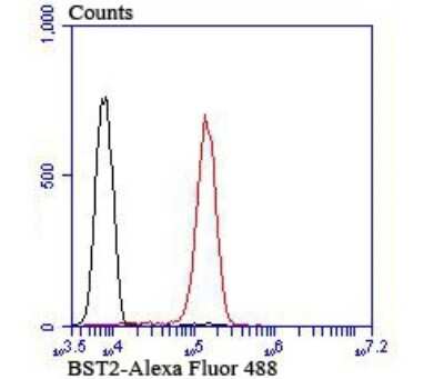 Flow Cytometry: BST2 Antibody (JU11-93) [NBP2-75423] - Analysis of Jurkat cells with BST2 antibody at 1/100 dilution (red) compared with an unlabelled control (cells without incubation with primary antibody; black).