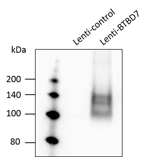 293T cells were infected by lentivirus overexpression of control or BTBD7 for 72h. Total cell lysates were subjected to western blot. PVDF membrane were probed with 1mm/ml Human BTBD7 Antibody. A specific band was detected for BTBD7 at approximately 138 kDa. This experiment was conducted under reducing conditions