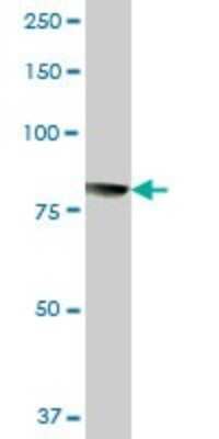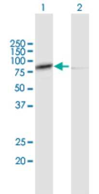 Western Blot: Calpain 1 Antibody [H00000823-B01P] - Analysis of CAPN1 expression in transfected 293T cell line by CAPN1 polyclonal antibody. Lane 1: CAPN1 transfected lysate(78.54 KDa). Lane 2: Non-transfected lysate.