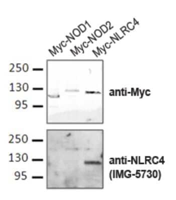 - This antibody was made against the following peptide immunogen sequence: DFSTKEFLPDPALVRKLSQ. The antibody would be expected to recognize any NLRC4 forms that contain the sequence used for immunogen. I did a quick blast search (ncbi.nih.gov) and 345, 359, 404 and 989 amino acid forms containing this the immunogen sequence were identified. Of course, all proteins can have post-translational modifications and cleavage forms which can contribute to variable banding patterns. The IMG-5730 antibody has been evaluated with over expressed NLRC4 as shown on the data data sheet, but not with endogenous lysate, so I am not sure what the of endogenous NLRC4 is expressed or what size endogenous NLRC4 bands would typically be recognized with this antibody in a given lysate.