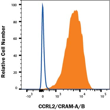 CCRL2, also known as CCR11, CRAM-A, CRAM-B, CKRX, and HCR, is a seven-transmembrane G-protein linked receptor that shares homology with other human chemokine receptors. The isoforms CRAM-A and CRAM-B differ at their N-termini by the insertion of an additional 12 amino acids in CRAM-A. CCRL2/CRAM‑A/B is expressed at varying levels on a variety of peripheral blood cells including monocytes, neutrophils, B cells, and T cells (1, 2). CCL19 has been identified as a ligand for CRAM-B (4). Human and mouse CRAM share approximately 47% amino acid sequence identity.
