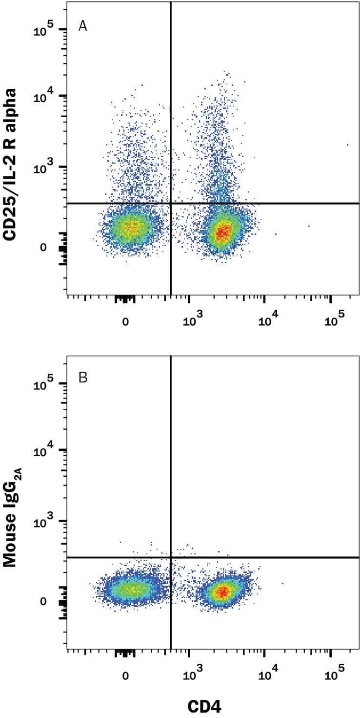 Human CD25, also known as IL-2 receptor alpha (IL-2 R alpha ) and asTac antigen, was initially identified as a 55 kDa membrane glycoprotein that is capable of binding IL‑2. The IL-2 R alpha cDNA encodes a 272 amino acid residue precursor Type I membrane protein with a 21 residue signal peptide, a 219 residue extracellular region, a 19 residue transmembrane region and a 13 residue cytoplasmic domain. IL-2 R alpha lacks structural features characteristic of members of the cytokine receptor superfamily. By itself, IL-2 R alpha binds IL-2 with low affinity. However, when IL-2 R alpha is associated with the IL-2 receptor beta and gamma chains, a high affinity heterotrimeric receptor complex that transduces IL-2 signals is formed. Soluble forms of many cytokine receptors have been reported, and a soluble form of IL-2 R alpha (IL-2 sR alpha ) appears in serum, concomitant with its increased expression on cells. The function of the soluble IL-2 R alpha is unclear. Increased levels of IL-2 sR alpha in biological fluids reportedly correlate with increased T and B cell activation and immune system activation. Increased serum concentration of IL-2 sR alpha has been observed in patients with a variety of inflammatory conditions and in the course of some leukemias and lymphomas.