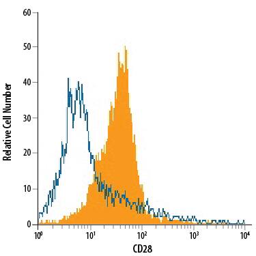 CD28 and CTLA-4, together with their ligands B7-1 and B7-2, constitute one of the dominant costimulatory pathways that regulate T and B cell responses. CD28 and CTLA-4 are structurally homologous molecules that are members of the immunoglobulin (Ig) gene superfamily. Both CD28 and CTLA-4 are composed of a single Ig V‑like extracellular domain, a transmembrane domain and an intracellular domain. CD28 and CTLA-4 are both expressed on the cell surface as disulfide-linked homodimers or as monomers. The genes encoding these two molecules are closely linked on human chromosome 2 and mouse chromosome 1. Mouse CD28 is expressed constitutively on virtually 100% of mouse T cells and on developing thymocytes. Cell surface expression of mouse CD28 is down-regulated upon ligation of CD28 in the presence of PMA or PHA. In contrast, CTLA-4 is not expressed constitutively but is upregulated rapidly following T cell activation and CD28 ligation. Cell surface expression of CTLA-4 peaks approximately 48 hours after activation. Although both CTLA-4 and CD28 can bind to the same ligands, CTLA-4 binds to B7‑1 and B7‑2 with a 20-100 fold higher affinity than CD28. CD28/B7 interaction has been shown to prevent apoptosis of activated T cells via the up-regulation of Bcl‑xL. CD28 ligation has also been shown to regulate Th1/Th2 differentiation. Agonist activity has been reported using MAB4831 (4,5).
