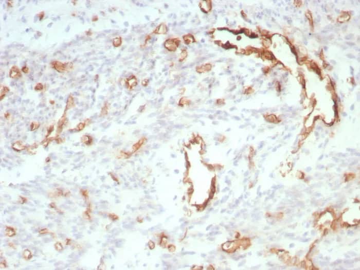 | Specificity | Anti-CD31 has shown to be highly specific and sensitive for vascular endothelial cells. Staining of nonvascular tumors (excluding hematopoietic neoplasms) is rare. CD31 monoclonal antibody reacts with normal, benign, and malignant endothelial cells which make up blood vessel lining. The level of CD31 expression can help to determine the degree of tumor angiogenesis, and a high level of CD31 expression may imply a rapidly growing tumor and potentially a predictor of tumor recurrence. |