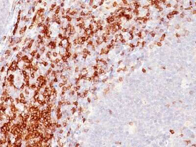 | Specificity | Recognizes a 67kDa transmembrane protein, which is identified as CD5. The CD5 antigen is found on 95% of thymocytes and 72% of peripheral blood lymphocytes. In lymph nodes, the main reactivity is observed in T cell areas. Anti-CD5 is a pan T-cell marker that also reacts with a range of neoplastic B-cells, e.g. chronic lymphocytic leukemia/small lymphocytic lymphoma (CLL/SLL), mantle cell lymphoma, and a subset (~10%) of diffuse large B-cell lymphoma. CD5 aberrant expression is useful in making a diagnosis of mature T-cell neoplasms. Anti-CD5 detection is diagnostic in CLL/SLL within a panel of other B-cell markers, especially one that includes anti-CD23. Anti-CD5 is also very useful in differentiating among mature small lymphoid cell malignancies. In addition, anti-CD5 can be used in distinguishing thymic carcinoma (+) from thymoma (-). Anti-CD5 does not react with granulocytes or monocytes. |