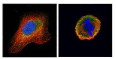 Immunocytochemistry/ Immunofluorescence: CDC25C Antibody [NBP1-33687] - Paraformaldehyde-fixed U2OS, using CDC25C antibody (Geen) at 1:500 dilution. Alpha-tubulin filaments were labeled with an alpha Tubulin antibody ...read more