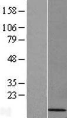 This product is intended for use as a positive control in Western Blot. Overexpression of the target protein was confirmed using an antibody to DDK (FLAG) epitope tag ( NBP1-71705) present on the protein construct. Each vial of cell lysate contains 100ug of total protein which should be sufficient for 20-50 reactions. Depending on over-expression level, antibody affinity and detection system, some lysates can go as low as 0.1 ug per load. We recommend starting with 5ug of cell lysate. Add an equal amount of cell lysate and 2X SDS Sample buffer and boil the SDS samples for 10 minutes before loading. |
