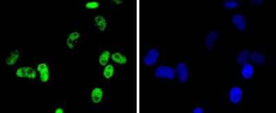 Immunocytochemistry/ Immunofluorescence: Cdk9 Antibody (SD204-07) [NBP2-67811] - Staining Cdk9 in Hela cells (green). The nuclear counter stain is DAPI (blue). Cells were fixed in paraformaldehyde, permeabilised with ...read more