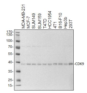 Western Blot: Cdk9 Antibody (SD204-07) [NBP2-67811] - MDA-MB-231, MCF-7, SUM149, SUM159, T47D, HCC1954, 4T1, B16-F10, Hep3b and 293T cells lysates (20 ug/lane). 10% SDS-PAGE. CDK9 (NB2-67811) primary antibody at 1:2000, ...read more
