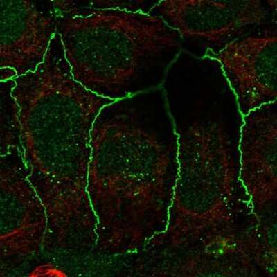 Immunocytochemistry/ Immunofluorescence: Claudin-2 Antibody [NBP2-58264] - Staining of human cell line CACO-2 shows localization to nucleoplasm & cell junctions. Antibody staining is shown in green.