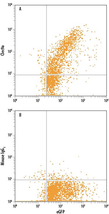 HEK293 human embryonic kidney cell line transfected with human Clec9a and eGFP was stained with either (A) Mouse Anti-Human CLEC9a Alexa Fluor® 700-conjugated Monoclonal Antibody (Catalog # FAB6049N) or (B) Mouse ...read more