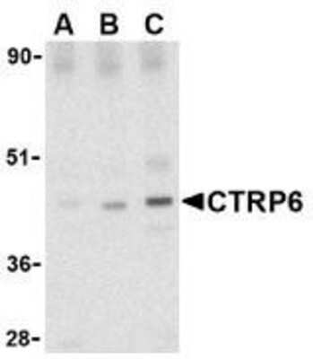 Antibody was raised against a 15 amino acid synthetic peptide from near the center of human CTRP6. The immunogen is located within amino acids 80 - 130 of CTRP6. Amino Acid Squence: GREGPQGEPGPQGSK |