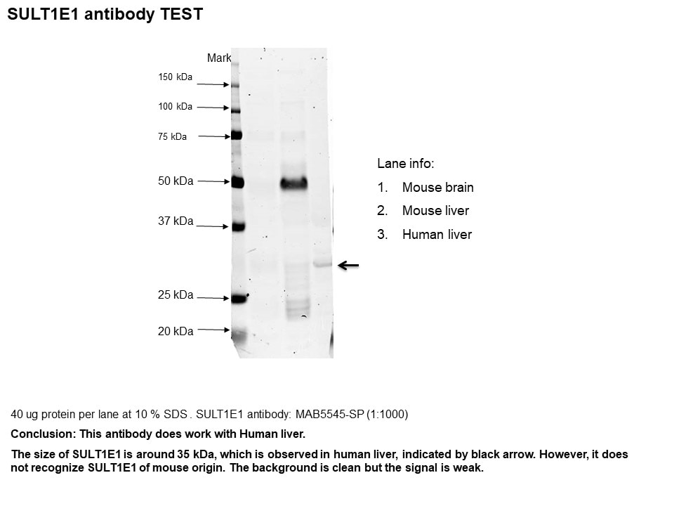| Immunogen | E. coli-derived recombinant human Cytosolic Sulfotransferase 1E1/SULT1E1 Asn2-Ile294 Accession # P49888 |
