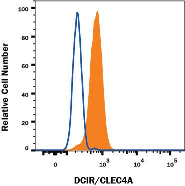Human peripheral blood neutrophils were stained with Mouse Anti-Human DCIR/CLEC4A Alexa Fluor® 488-conjugated Monoclonal Antibody (Catalog # FAB1748G, filled histogram) or isotype control antibody (Catalog # ...read more