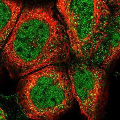 Immunocytochemistry/ Immunofluorescence: Dectin-1/CLEC7A Antibody [NBP2-13845] - Staining of human cell line A-431 shows localization to nucleoplasm & vesicles. Antibody staining is shown in green.