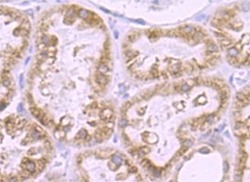 Immunohistochemistry-Paraffin: DKC1 Antibody (JU34-32) [NBP2-75472] - Analysis of paraffin-embedded human kidney tissue with Rabbit anti-DKC1 antibody washed with ddH2O and PBS, and then probed with the primary antibody ...read more
