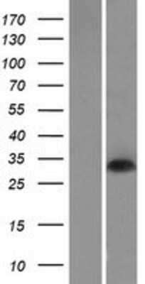 This product is intended for use as a positive control in Western Blot. Overexpression of the target protein was confirmed using an antibody to DDK (FLAG) epitope tag ( NBP1-71705) present on the protein construct. Each vial of cell lysate contains 100ug of total protein which should be sufficient for 20-50 reactions. Depending on over-expression level, antibody affinity and detection system, some lysates can go as low as 0.1 ug per load. We recommend starting with 5ug of cell lysate. Add an equal amount of cell lysate and 2X SDS Sample buffer and boil the SDS samples for 10 minutes before loading. |