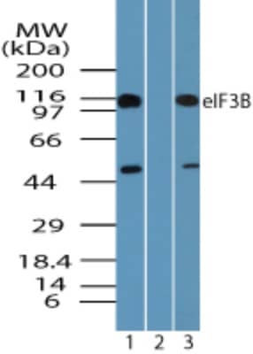 Western Blot: EIF3B Antibody [NBP2-24571] - analysis of eIF3B in A431 cell lysate in the 1) absence and 2) presence of immunizing peptide and 3) NIH 3T3 cell lysate using eIF3B antibody at 0.25 ug/ml, 0.25 ug/ml and ...read more