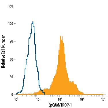 HT-29 human colon adenocarcinoma cell line was stained with Mouse Anti-Human EpCAM/TROP-1 Fluorescein-conjugated Monoclonal Antibody (Catalog # FAB9601F, filled histogram) or isotype control antibody (Catalog # IC0041F, ...read more
