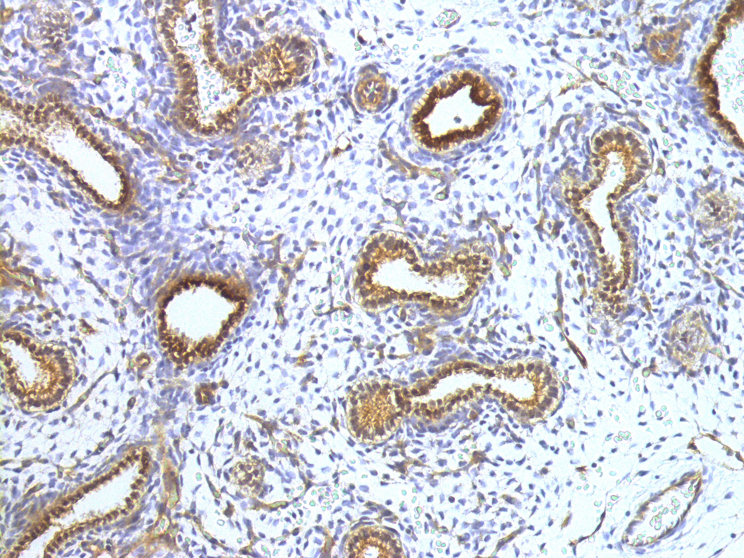good immunoperoxidase staining of IHC-P on human and mouse tissue with this antibody at a dilution 1:500. The section was pre-treated by heat mediated antigen retrieval with sodium citrate buffer (pH6).