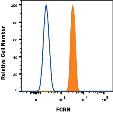 The neonatal Fc receptor (FCRN) is an approximately 45 kDa transmembrane glycoprotein with structural homology to MHC class I proteins. It is widely expressed in endothelial and epithelial cells and plays an important role in IgG homeostasis and antigen presentation by dendritic cells (1, 2). Mature human FCRN consists of a 274 amino acid (aa) extracellular domain (ECD) with two N-terminal alpha domains, one alpha 3/immunoglobulin-like domain, a 23 aa transmembrane segment, and a 44 aa cytoplasmic domain (3). Within the ECD, human FCRN shares 68% aa sequence identity with mouse and rat FCRN. Mouse FCRN binds with high affinity to IgG from mouse, human, rat, rabbit, guinea pig, bovine, and sheep, while human FCRN binds IgG with significantly lower affinity and is much more restricted in terms of species recognition (4). It does not bind the structurally related chicken IgY (5). FCRN additionally binds to albumin, and both it and IgG are bound at pH 5.0 but not at pH 8.0 (3, 6). FCRN associates noncovalently with beta 2-Microglobulin, and this interaction is important for the intracellular trafficking of FCRN (7-10). FCRN cycles between the plasma membrane and acidified intracellular compartments of endothelial cells and epithelial cells (5, 8). It binds endocytosed IgG and albumin in the low pH vesicles and transports them to the plasma membrane for extracellular release at higher pH. This protects IgG and albumin from lysosomal degradation and helps maintain the circulating levels of both proteins (5, 6). This mechanism is involved in the bidirectional transport of IgG across epithelial and endothelial barriers including neonatal IgG absorption in the intestine and fetal uptake of maternal antibodies through the placenta (5, 8, 11, 12). In the kidney, FCRN recycles albumin to the serum but removes IgG from the glomular basement membrane and promotes its excretion into the urine (13, 14). FCRN is also expressed in neutrophils and myeloid antigen presenting cells (7, 15, 16). It can enhance IgG-mediated phagocytosis and antigen presentation by these cells, but it promotes the degradation of opsonizing IgG rather than returning it to the circulation (15, 16).