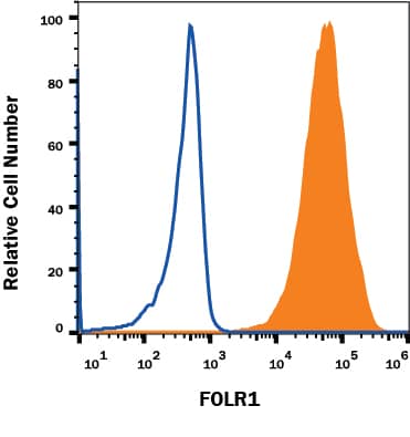 Folate Receptor 1 (FOLR1), also known as Folate Receptor alpha and Folate Binding Protein (FBP), is a 37‑42 kDa protein that mediates the cellular uptake of folic acid and reduced folates. Dietary folates are required for many key metabolic processes including nucleotide and methionine synthesis, the interconversion of glycine and serine, and histidine breakdown (1, 2). Mature FOLR1 is an N-glycosylated protein that is anchored to the cell surface by a GPI linkage (3‑6). Human FOLR1 shares 83% amino acid sequence identity with mouse and rat FOLR1. FOLR1 is predominantly expressed on epithelial cells and is dramatically up‑regulated on many carcinomas (7, 8). It is critically required during early embryogenesis as shown in knockout mice which die
