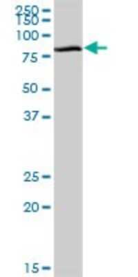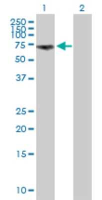 Western Blot: GGA1 Antibody [H00026088-B01P] - Analysis of GGA1 expression in transfected 293T cell line by GGA1 polyclonal antibody. Lane 1: GGA1 transfected lysate(60.72 KDa). Lane 2: Non-transfected lysate.