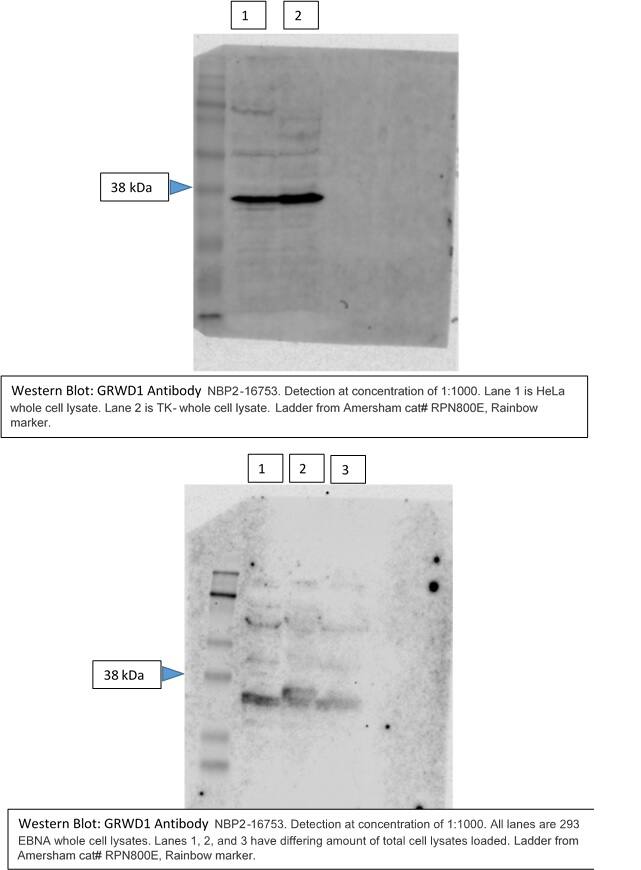 | Immunogen | Recombinant protein encompassing a sequence within the center region of human GRWD1. The exact sequence is proprietary. |
