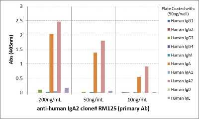| Specificity | Monoclonal anti-Human IgG is derived from a hybridoma produced by the fusion of mouse myeloma cells and splenocytes from an immunized mouse. It is specific for the whole human IgG molecule, and has no cross reactivity with human IgM molecule as determined by an ELISA. |