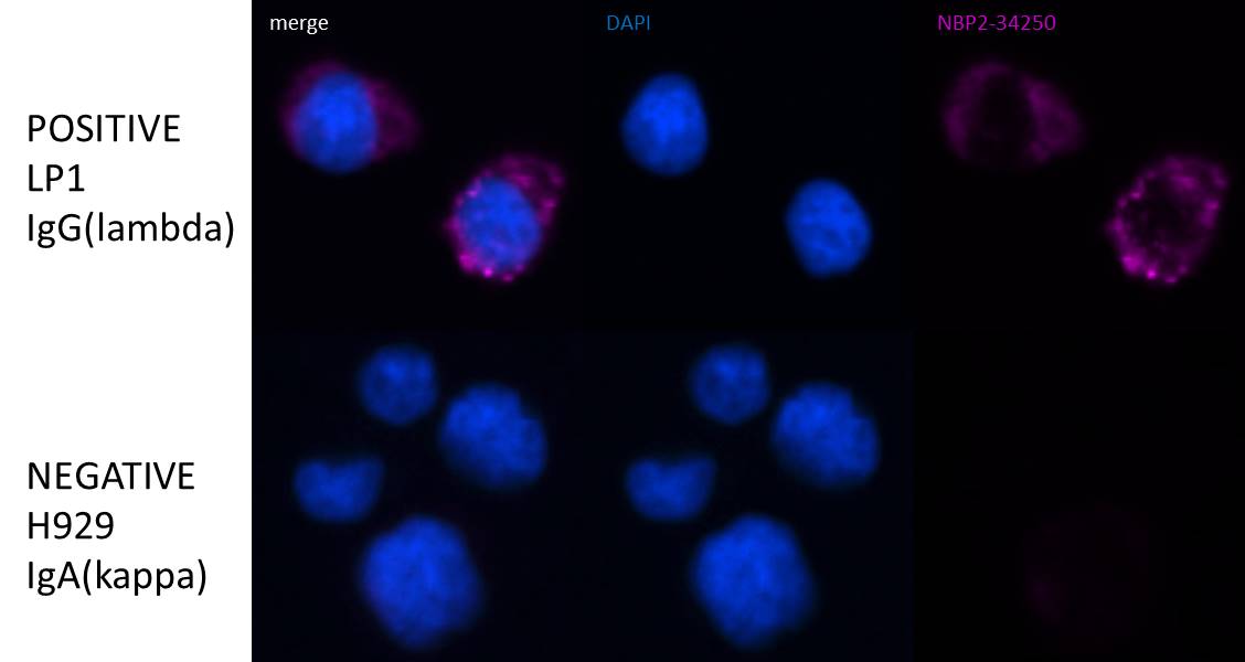 | Specificity | Recognizes a protein of 75kDa, identified as gamma heavy chain of human immunoglobulins. It does not cross-react with alpha (IgA), mu (IgM), epsilon (IgE), or delta (IgD), heavy chains, T-cells, monocytes, granulocytes, or erythrocytes. This monoclonal antibody is useful in the identification of leukemias, plasmacytomas, and certain non-Hodgkin s lymphomas. The most common feature of these malignancies is the restricted expression of a single heavy chain class. Demonstration of clonality in lymphoid infiltrates indicates that the infiltrate is clonal and therefore malignant. |