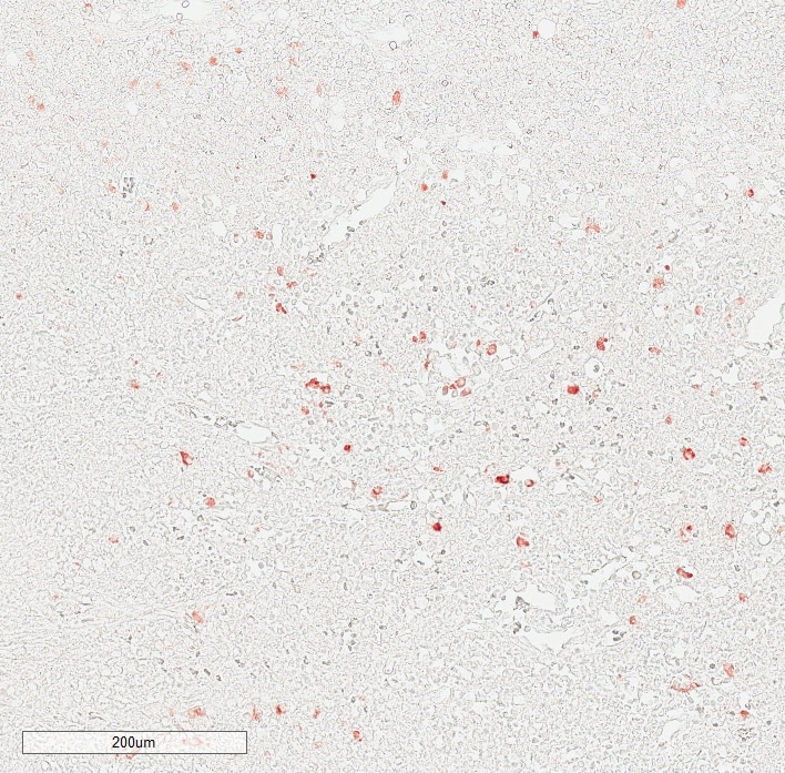 | Specificity | Recognizes a protein of 75kDa, identified as mu heavy chain of human immunoglobulins. It does not cross-react with alpha (IgA), gamma (IgG), epsilon (IgE), or delta (IgD), heavy chains, T-cells, monocytes, granulocytes, or erythrocytes. This monoclonal antibody is useful in the identification of leukemias, plasmacytomas, and certain non-Hodgkin s lymphomas. The most common feature of these malignancies is the restricted expression of a single heavy chain class. Demonstration of clonality in lymphoid infiltrates indicates that the infiltrate is clonal and therefore malignant. |
