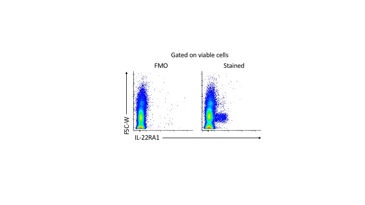 The IL-22 receptor, also known as IL-22 R alpha 1 and CRF2-9, is an approximately 65 kDa type I transmembrane glycoprotein that belongs to the type II cytokine receptor family (CRF). IL-22 R alpha 1 contains a 211 amino acid (aa) extracellular domain (ECD) with two fibronectin type III repeats, and a 330 aa cytoplasmic domain (1). Within the ECD, mouse IL-22 R alpha 1 shares 78%, 78%, and 94% aa sequence identity with canine, human, and rat IL-22 R alpha 1, respectively. It shares 20%‑26% aa sequence identity with the ECDs of other class II receptors IL-10 R, IL-20 R, and IL-28 R. IL-22 R alpha 1 associates with either IL-10 R beta or IL-20 R beta to form receptor complexes with distinct ligand selectivities. IL-10 R beta is a shared subunit of the IL-10, -22, -26, -28, and -29 receptors, while IL-20 R beta is a shared subunit of the IL-19, -20, -22, and -24 receptors (2). IL-22 R alpha 1/IL-10 R beta is an IL-22 responsive receptor (3, 4), and IL-22 R alpha 1/IL-20 R beta is an IL-20 or IL-24 responsive receptor (5, 6). In both cases, IL‑22 R alpha 1 functions as the high affinity ligand binding subunit, and subsequent association with IL-10 R beta or IL-20 R beta serves to stabilize the complex (3, 6‑9). IL‑22 R alpha 1 contains cytoplasmic motifs for interactions with signal transduction molecules, but association with IL-10 R beta or IL-20 R beta is required for signal transduction (3, 7). IL-22BP functions as a competitive antagonist by binding IL-22 and preventing its association with IL-22 R alpha 1 (8, 10). Even though it is a receptor for interleukins, IL‑22 R alpha 1 is not expressed on hematopoietic cells (7, 11, 12). Instead, IL-22 R alpha 1 expression is restricted to epithelial and stromal cells (7, 11‑14). IL‑22 R alpha 1 signaling promotes innate immune responses and wound healing at sites of infection and inflammation. This includes upregulation of antimicrobial, acute phase, proinflammatory, and extracellular matrix proteins as well as proteases (4, 12, 14, 15). IL‑22 R alpha 1 signaling also promotes downregulation of proteins involved in keratinocyte differentiation (4, 15).